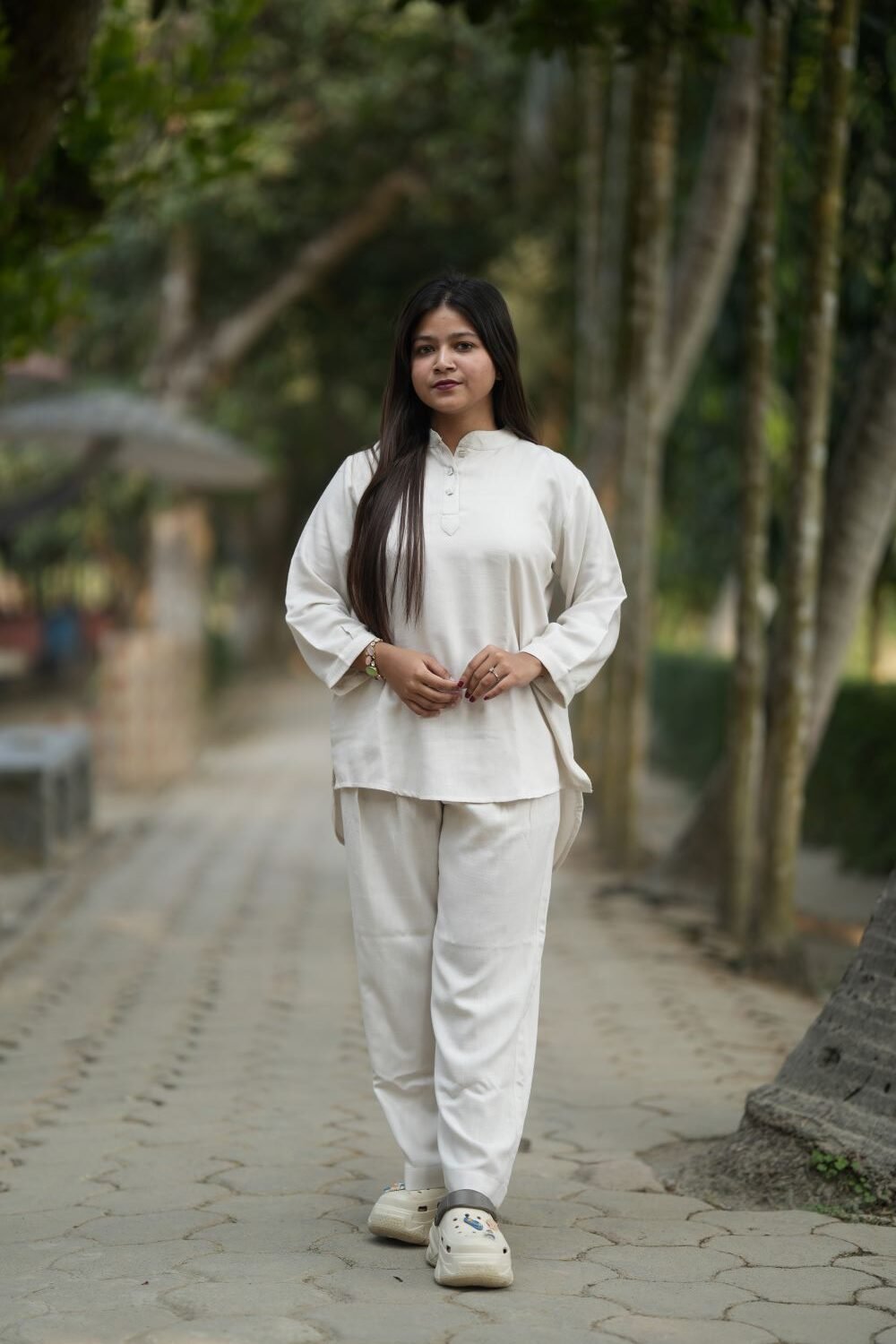 You love clean elegance. Grab this crisp off-white women’s co-ord set now. It fits your busy life in Bangladesh. Feel the luxury. You wear premium slub cotton. Textured fabric breathes easily. Relaxed fit moves with you. Pure off-white shade gives a fresh, sophisticated look. It pairs beautifully with any style.
